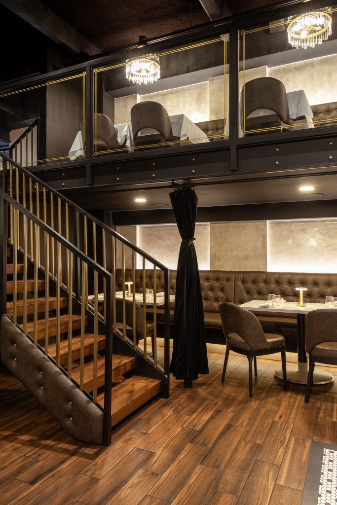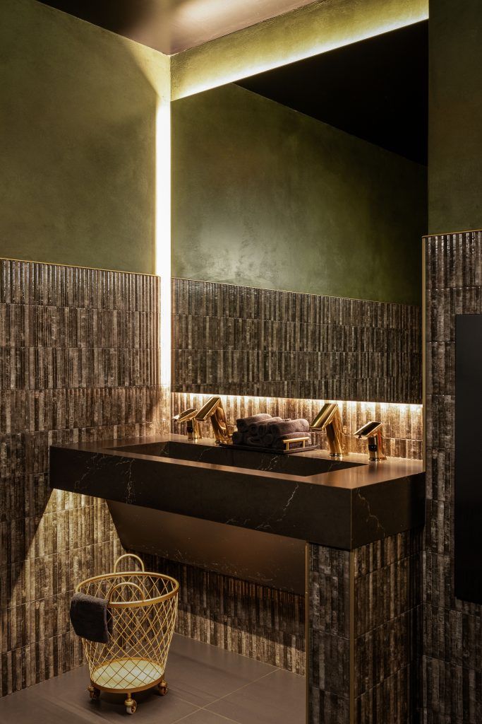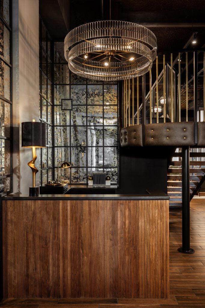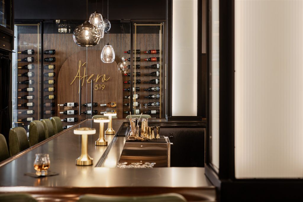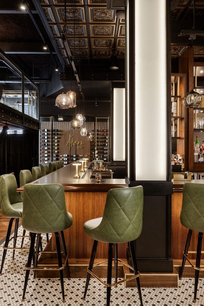 At the heart of the restaurant, the wrap-around bar acts as its own gathering point—fluid, social, and always in motion. Custom banquettes, back-lit columns, and a mix of crystal and circular chandeliers cast a soft, atmospheric glow across the space, layering light in a way that feels both modern and familiar. Greenery threads through the black-and-gold palette, giving the interior a calm, organic counterpoint.