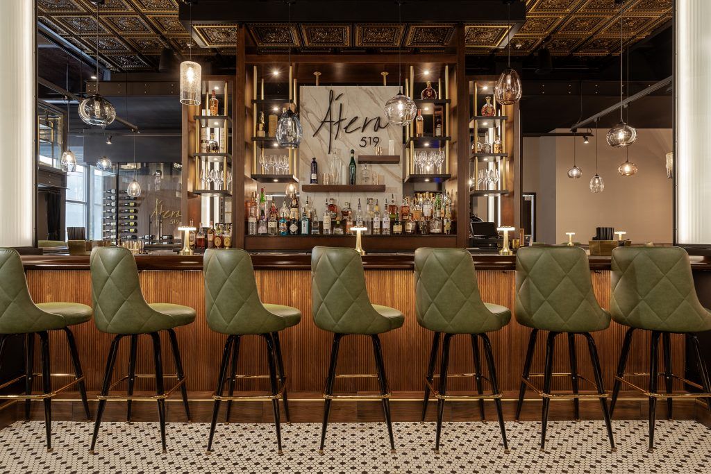 A’tera brings a new rhythm to downtown Scranton, reshaping a former early-1900s car dealership into a modern dining space with an easy sense of elegance. What was once a dark nightclub has been transformed into a warm, intimate interior—anchored by clean lines, tactile materials, and a layout that guides guests naturally through the experience. The front dining room frames Courthouse Square with oversized bifold doors, a linear fireplace, and a ceiling detailed like a quiet piece of sculpture.